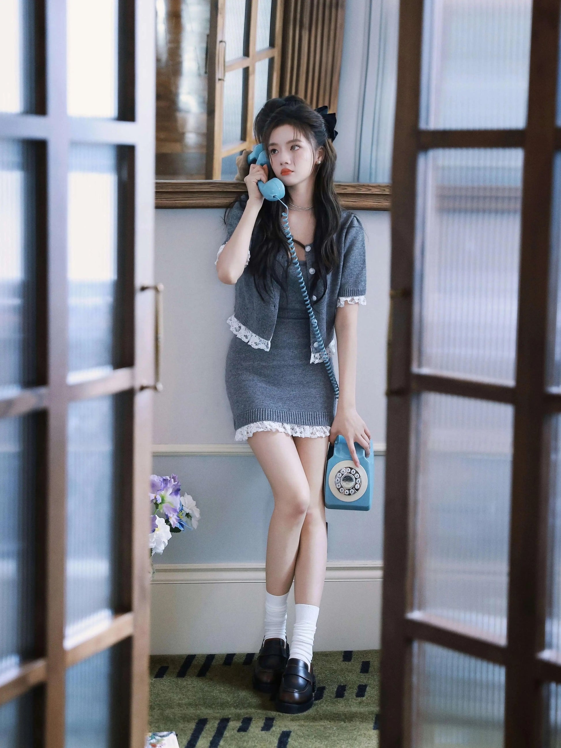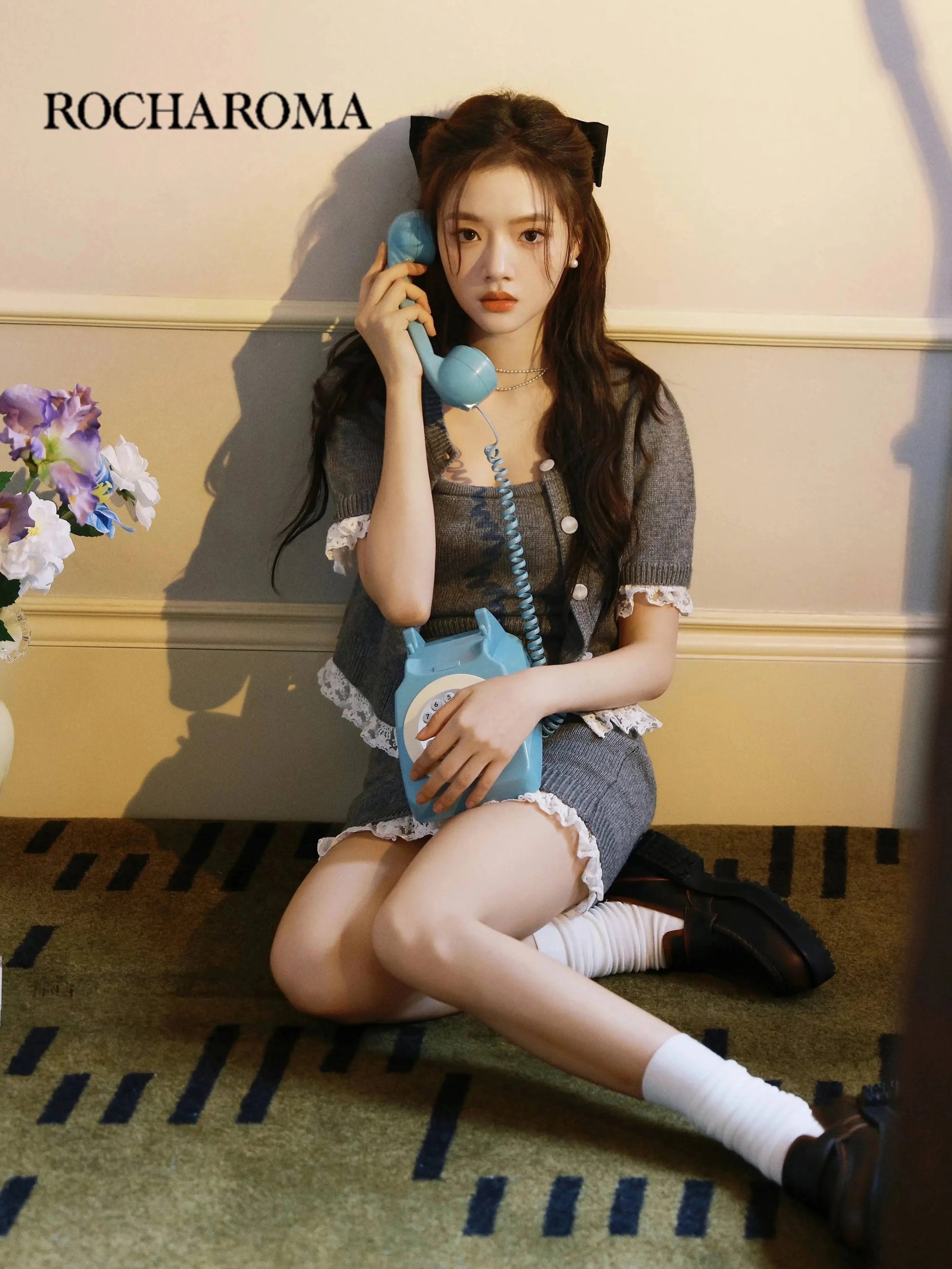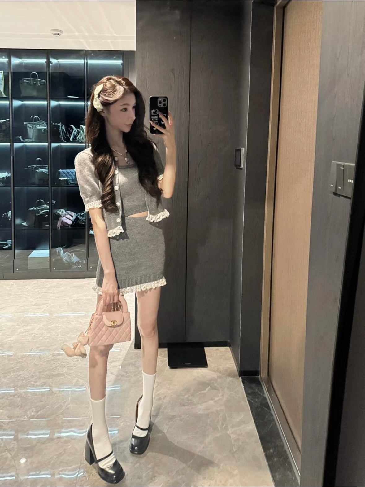 ROCHA ROMA | Grey Detachable Lace-Trim Knitwear Set (Cardigan+Tank Top+Skirt)