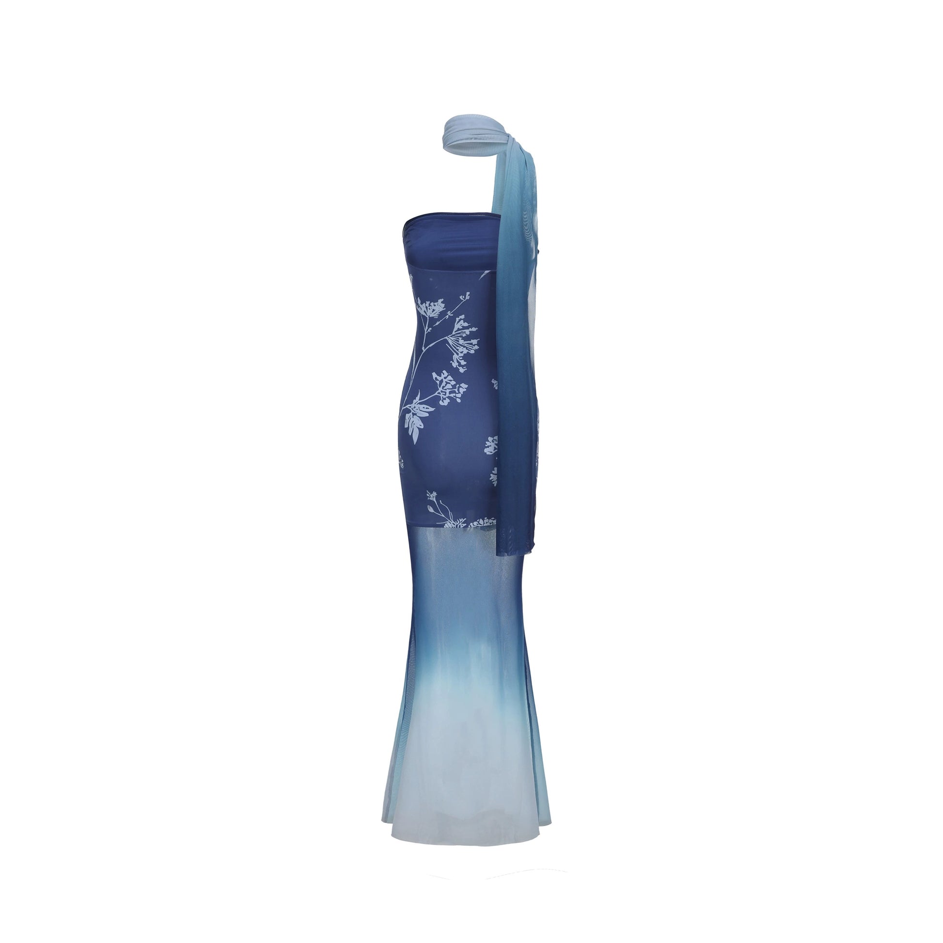 XENASERA | Blue and White Porcelain Print Strapless Mesh Dress (with Scarf)