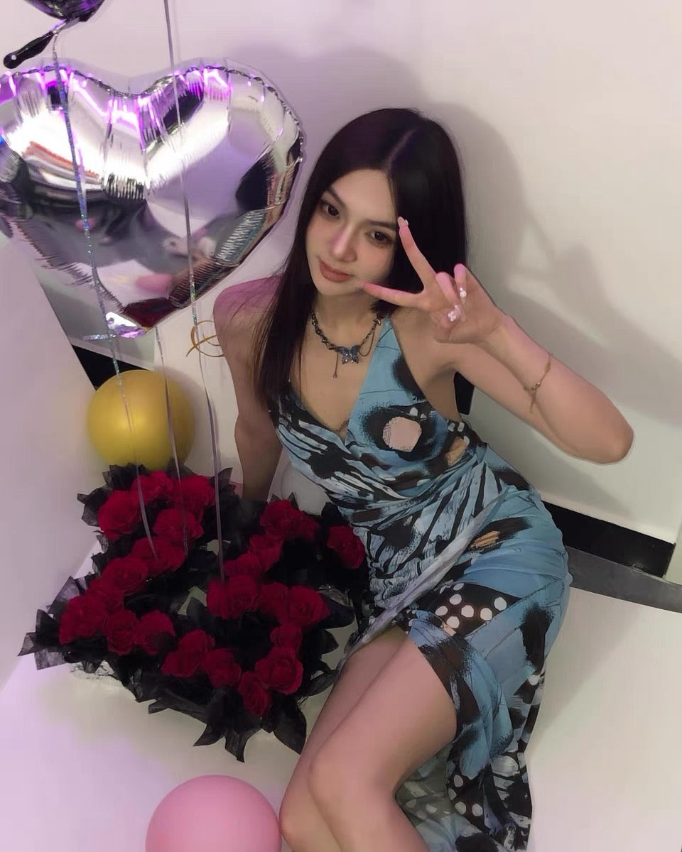 V领印花挂脖式绑带连衣裙